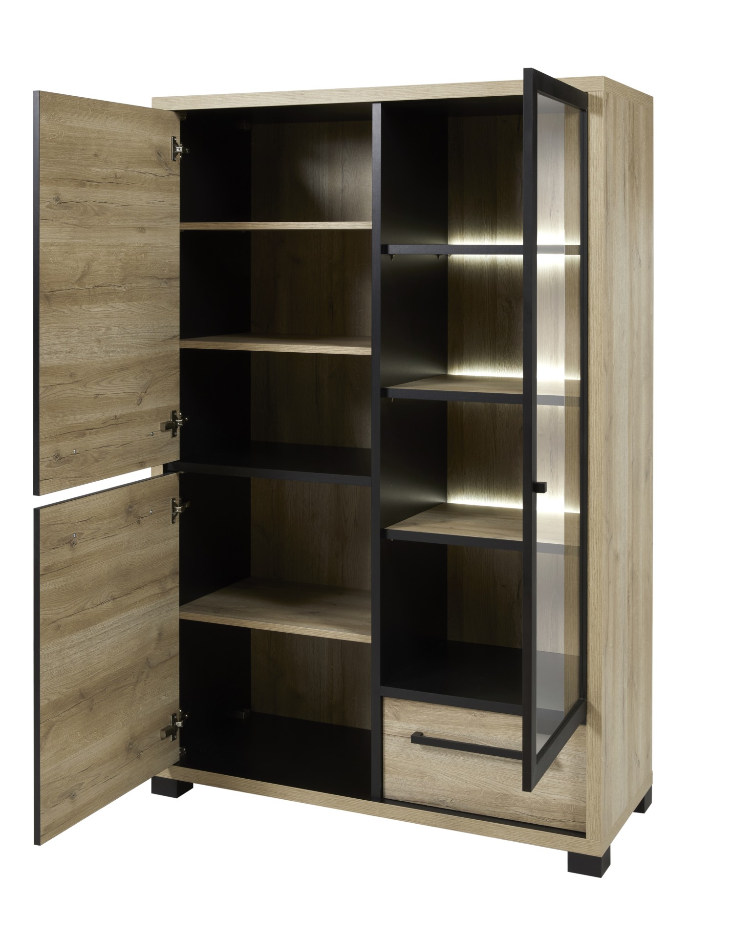 Vitrinekast 2 deuren + glasdeur en laden, uitgevoerd in het warme Arizona oak met accenten in zwart.
