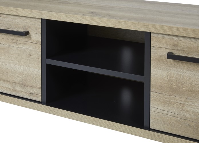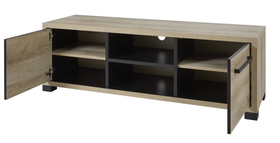 Tv-meubel met 2 deuren en open nis, uitgevoerd in het warme Arizona oak met accenten in zwart.